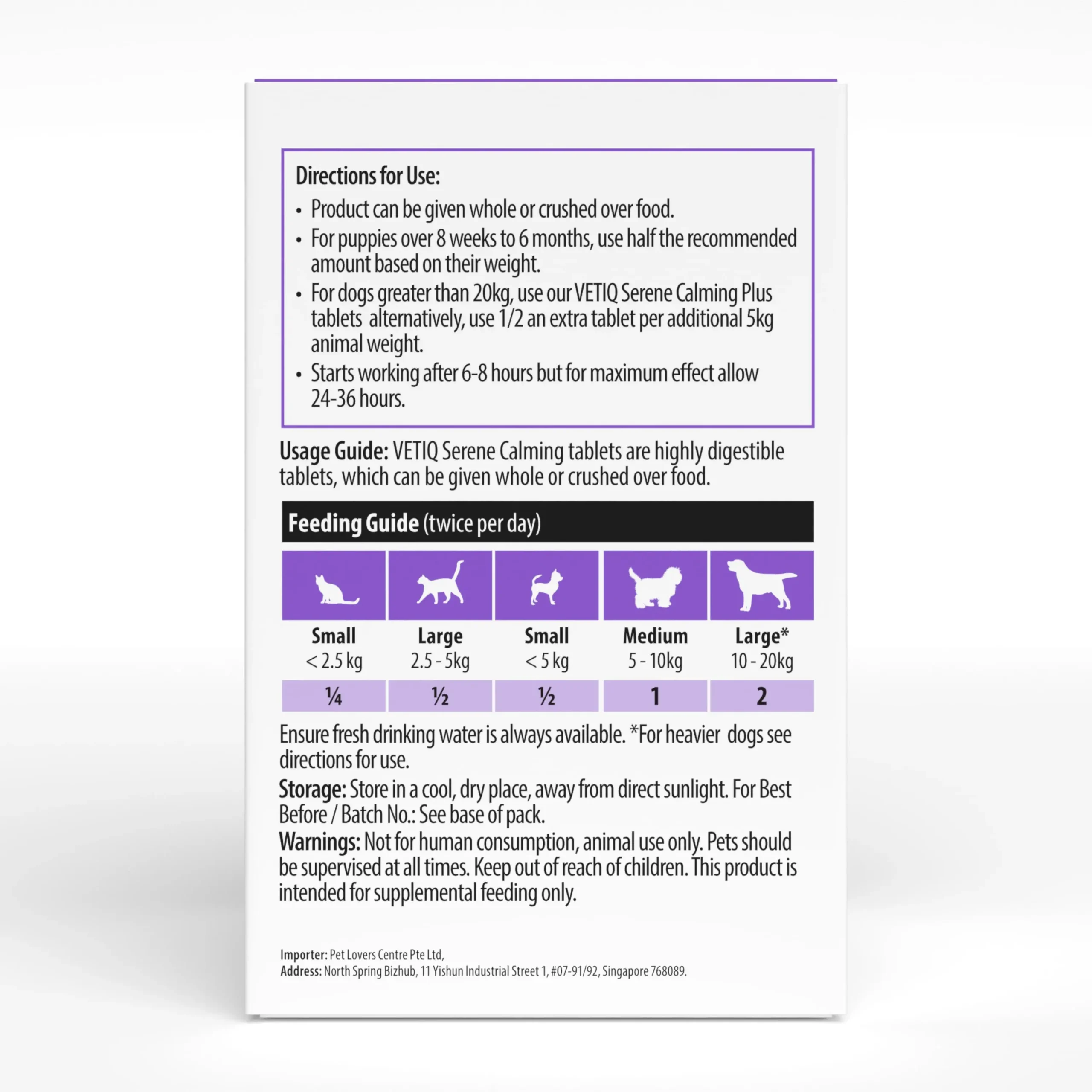 VETIQ® Serene Calming calme naturellement et aide à l’apaisement. Les comprimés VETIQ® Serene Calming sont formulés à partir d’ingrédients naturels pour les chats et les chiens hyperactifs ou nerveux. Les comprimés aident votre animal à rester calme pendant les périodes de stress et d’anxiété telles que les feux d’artifice, les orages ou l’anxiété de séparation, pour n’en citer que quelques-unes. Les comprimés peuvent être pris sans effet sédatif. VETIQ® Serene Calming est totalement sûr et efficace et peut être utilisé pendant des périodes prolongées. VETIQ® Calme Serein est un produit de base dans l’armoire !